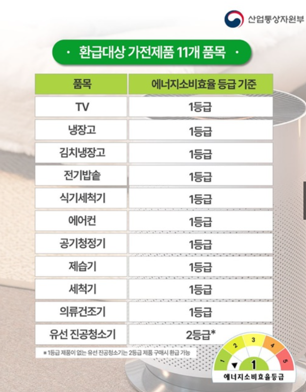 ✔ 가전제품의 에너지효율등급이 1등급 제품이어야 환급이 가능합니다.