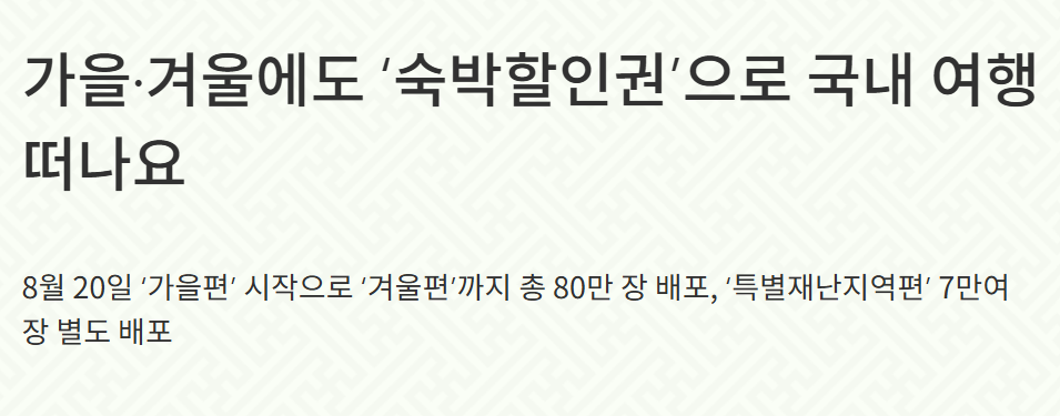 | 가을편 및 특별재난지역편 | 8월 20일 ~ 10월 30일 | 비수도권, 특별재난지역 | - 7만 원 이상 숙박상품: 3만 원 할인 - 7만 원 미만 숙박상품: 2만 원 할인 - 특별재난지역: 최대 5만 원 할인 |